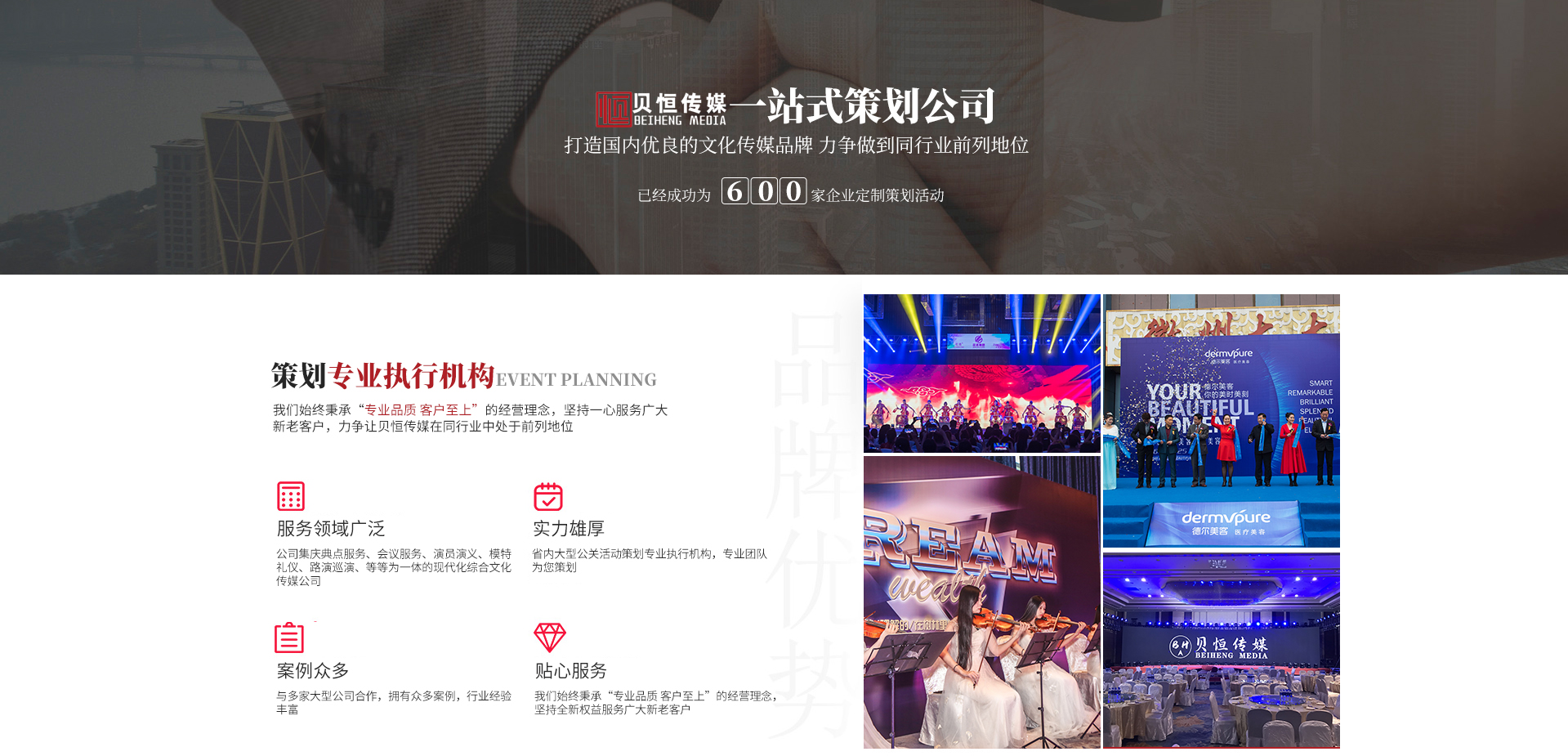 合 肥 貝 恒 文 化 傳 媒 專注·專業·專心·效率   合肥貝恒文化傳媒有限公司2017年成立于安徽·合肥,是省內大型公關活動策劃專業執行機構,公司集慶典服務、會議服務、演員演藝、模特禮儀、路演巡演、展會特裝、廣告制作、設備租賃、舞美策劃、企業形象宣傳等為一體的現代化綜合文化傳媒公司,我們始終秉承“專業品質客戶至上”的經營理念,堅持全...